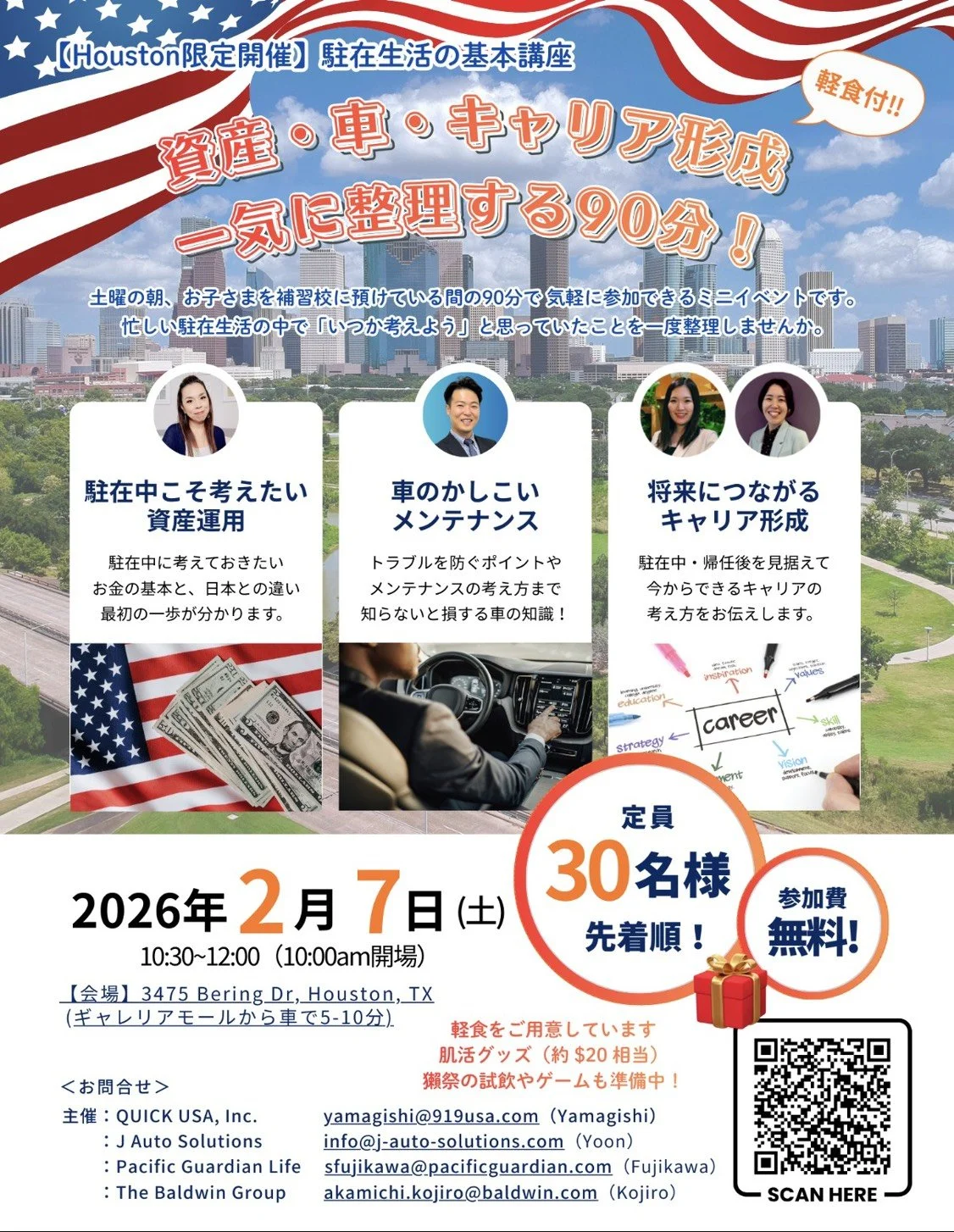 そしてアメリカでのキャリア相談実績 No.1 の QUICK USA。本セミナーでは、資産・車・キャリア、知識だけで終わらない、アメリカ生活に本当に役立つ視点をお届けします。Shinobuさんからは、アメリカの経済・賃金・資産形成を“今の現実”に即して読み解く視点を。Yoonさんからは、日々の生活に直結する「車」との賢い付き合い方を、Houstonという地域特性を踏まえて具体的に。QUICK USAからは、駐在中・永住中の経験を将来につなげるためのキャリア形成の考え方と選択肢をお伝えします。●日時:2026年2月7日(土)10:30 am~12:00 pm(受付開始:10:00~)●場所:J. Auto Solutions 3475 Bering Dr, Houston, TX (ギャレリアモールから車で5-10分です)